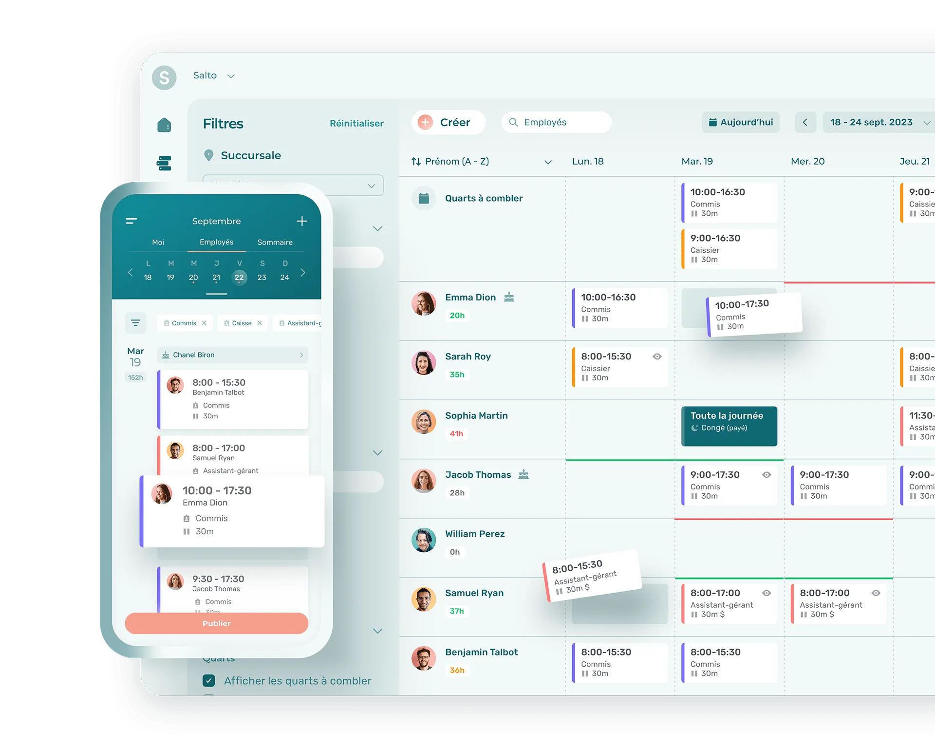 Assignez automatiquement les quarts de travail de vos employés en tenant compte des disponibilités, des congés et d’autres exigences.
