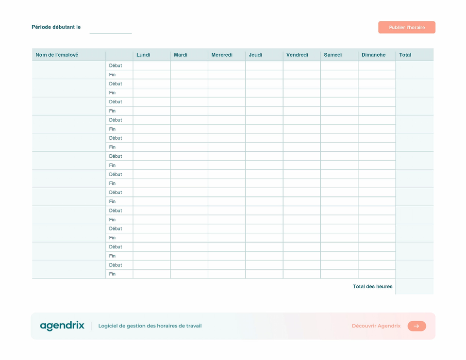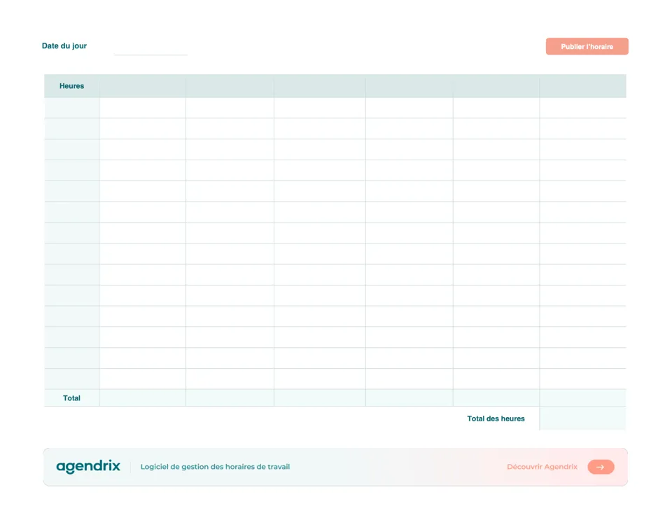 Envie d’une solution encore plus simple? Agendrix vous propose un logiciel de gestion d’horaires de travail en ligne qui vous permet de créer facilement vos plannings et de les partager à vos employés en un clic.