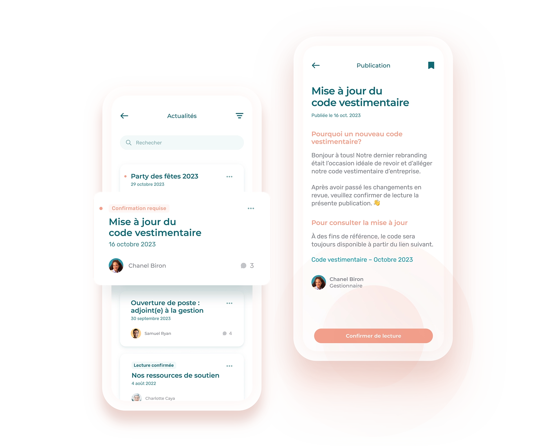 Utilisez le fil d’actualité pour publier messages et documents internes auxquels vos employés pourront toujours se référer. Parfait pour les politiques et guides, les événements d’entreprise et le recrutement interne.